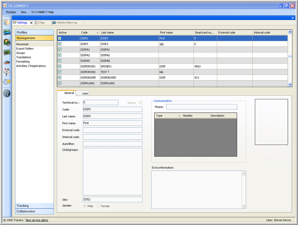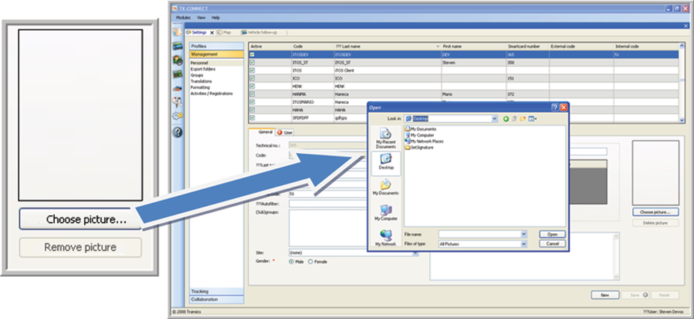 All pictures that have been saved in TFM (Transics Fleet Monitor), e.g. from staff members, will no longer be available in TX-CONNECT. This is due to the use of different databases (TFM gets the information from the fleet database, whereas TX-CONNECT gets all the information from the central database). Consequently, you will have to import all pictures in TX-CONNECT again.