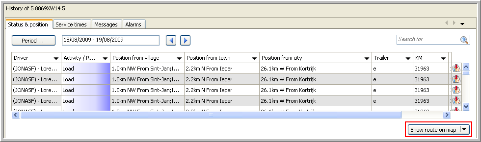 To view the route of the selected vehicle for a certain period on map, click on the Show route on map button.