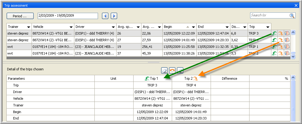 The difference between both trips will be displayed in (absolute) numbers (see column “Difference”) and in percentage (see column “%”). In case of improvement, the column "%" will be indicated in green (this is only the case for the most relevant parameters). In case of deterioration, this column will be indicated in red.