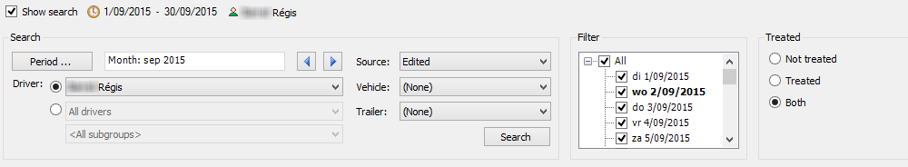 The collapsible selection area in the upper part of the screen contains a search field and a filter. In the search field, you can specify your search by selecting a period / source / driver / vehicle / trailer and/or order. The filter contains the elements that correspond to the search you made. You can select one driver at a time in the filter. Dates displayed in bold contain information.
