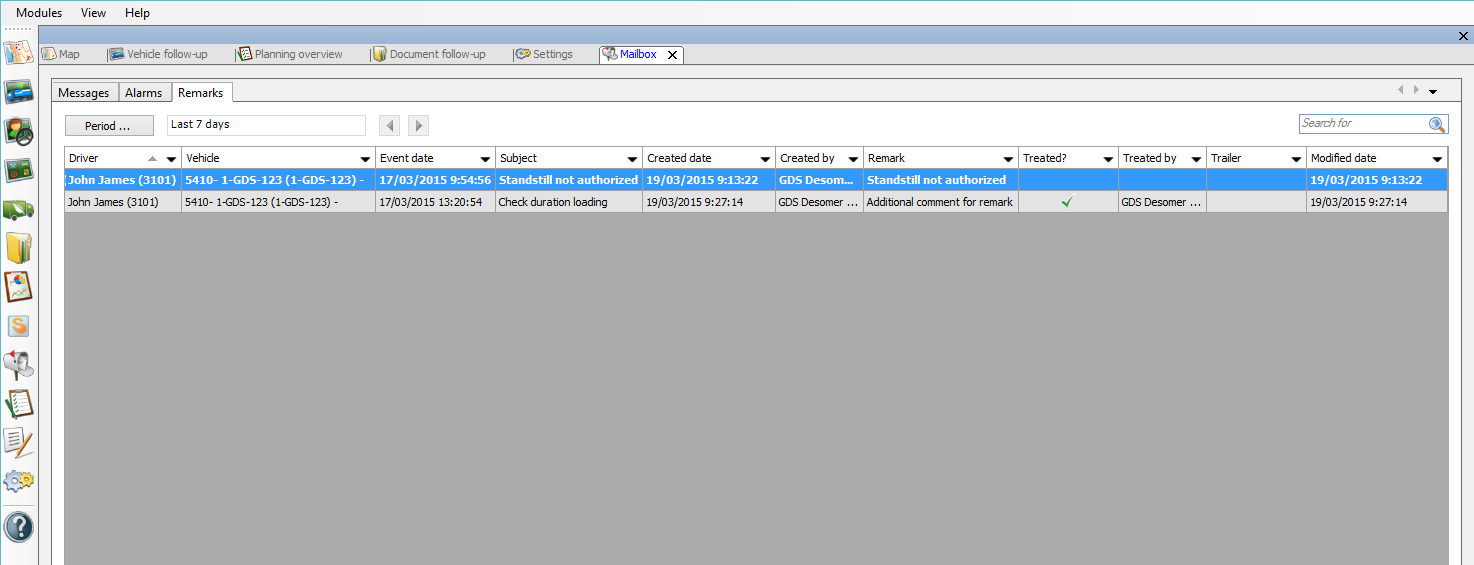 Note that this check mark can only be removed by the dispatcher who treated the remark in the first place and that a remark can only be deleted by the dispatcher who created it.