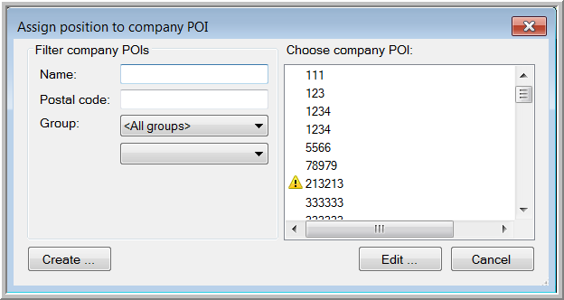 The new window "Assign position to company POI" contains a filter, allowing you to search the POI to which you wish to link the position. POIs without position coordinates are marked with the