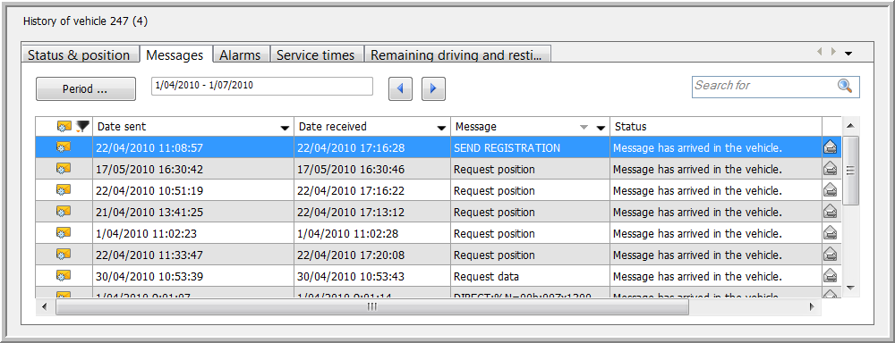 Click the drop down next to the "Send message" icon and select "Request position" if you want to receive information on the vehicle’s position, the driver, the driver’s driving and resting times and the current activity.