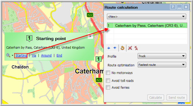 Once you have found an address for your route, you can assign a route point to it. From the moment you click the Starting button, to set this address as the first point of your route, the "Route calculation" window will open. Make sure you set a starting point and an end point to be able to calculate the route.
