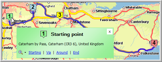 As long as this function is activated, the user can add route points just by clicking on the map. The first point is automatically set as "Starting point", while the last point has to be set by the user as "End point". All points in between can be set as hard or soft via points.