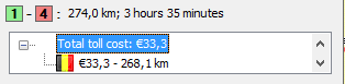 Press Calculate to calculate the route with the configured route points and settings. The route will be calculated according to the order in which the addresses were entered in the list. In the bottom left corner of the window, the number of kilometers between the starting and end point is shown, as well as the estimated time (based on truck speed) necessary to get from the starting to the end point. If the route goes over the sea, the number of kilometers and the average ferry time are shown. If there are toll costs (vignettes ...) to be paid, these are shown per country in the respective currency. Good to know: