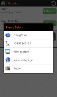 In case a phone number was added to the planning item (“TEL:” in the comment line), the number is added to the TX-SMART place options. Tap the number to start a voice call.