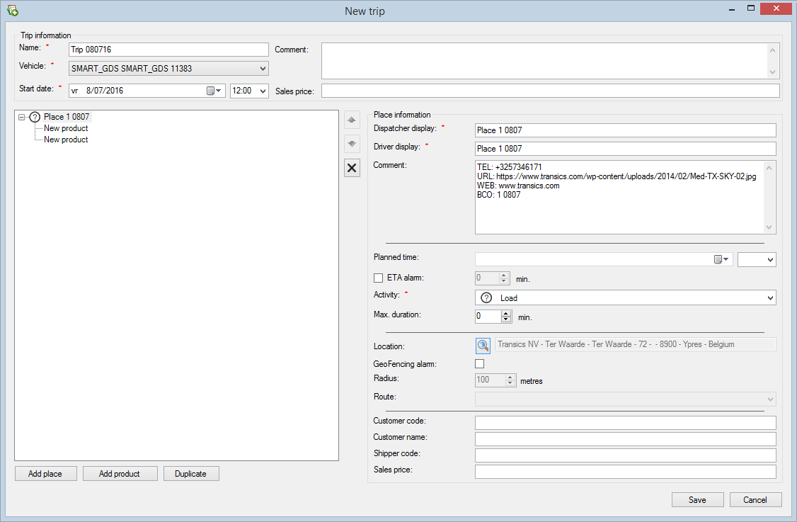 Assign a precise position to the selected place. This can be an address or a company POI. Note: As from TX-CONNECT v11, GPS coordinates can also be sent to TX-SMART devices. |