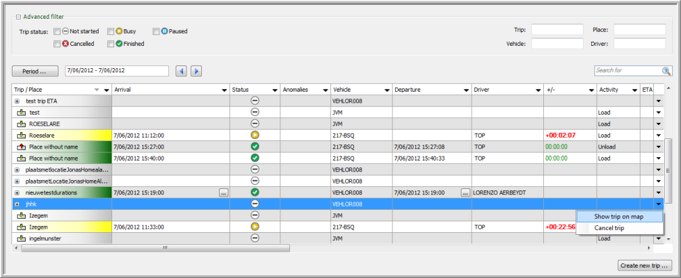 § The upper part of the screen contains a collapsible Advanced filter, where you can filter on trip status and name. Note that the status filter only applies to the parent level (trip or place level).