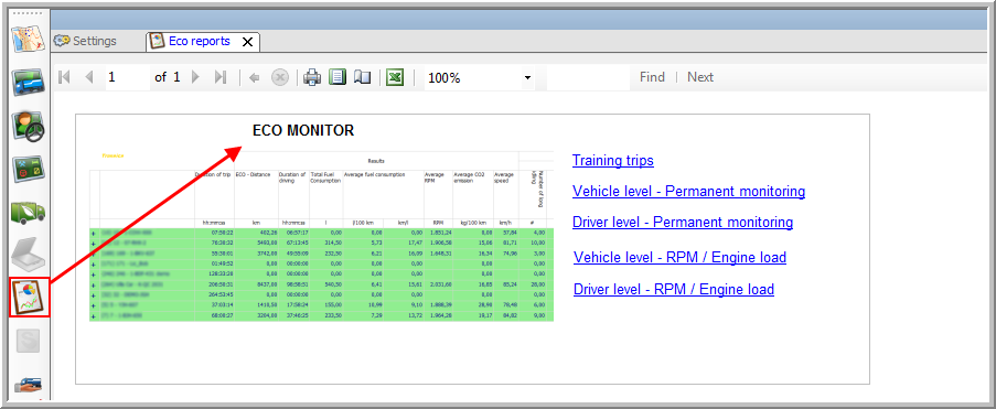 The ECO MONITOR module provides detailed statistics on trips, vehicles and drivers. This module contains several subreports: