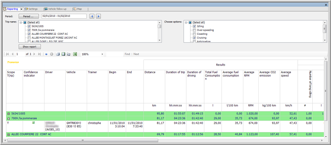 The accuracy of the data is reflected by a Confidence indicator ( / ). The green line in the report contains the weighted mean of the trips with the same name. Only values with a green square are used to calculate these values.