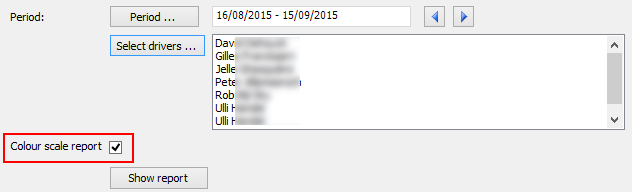 The report data are color coded according to 10 color scales. By clicking the driver's name on the left, a detailed report will be generated (cf. Detailed report below).