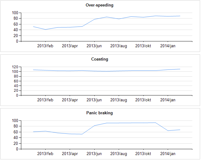 This report contains a radar chart showing the trend and evolution compared to the fleet average as well as a line chart per driving parameter.