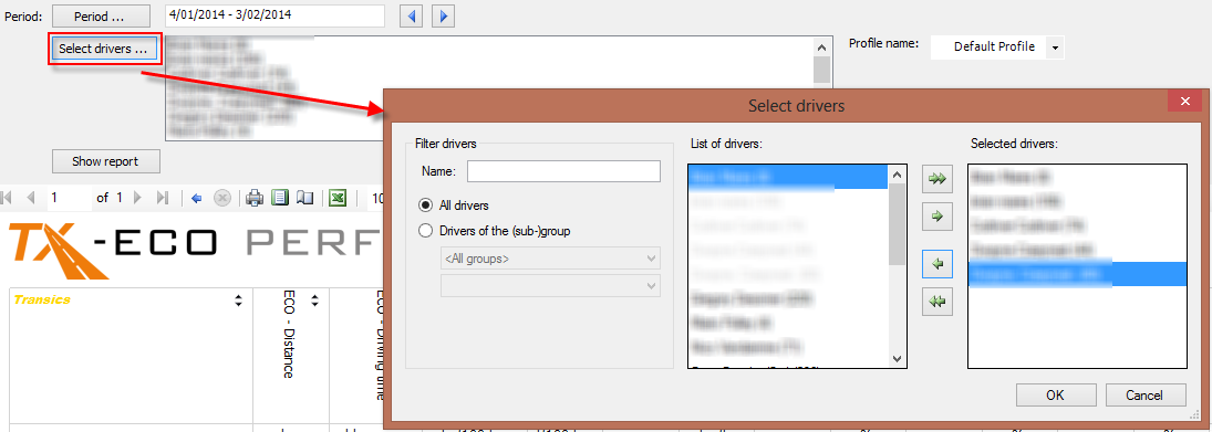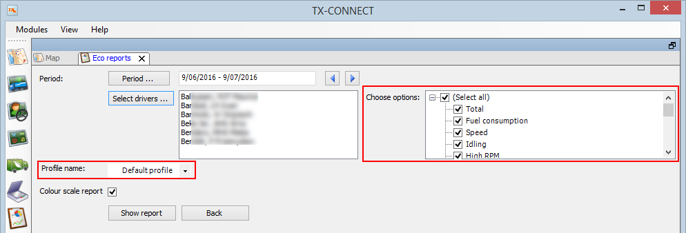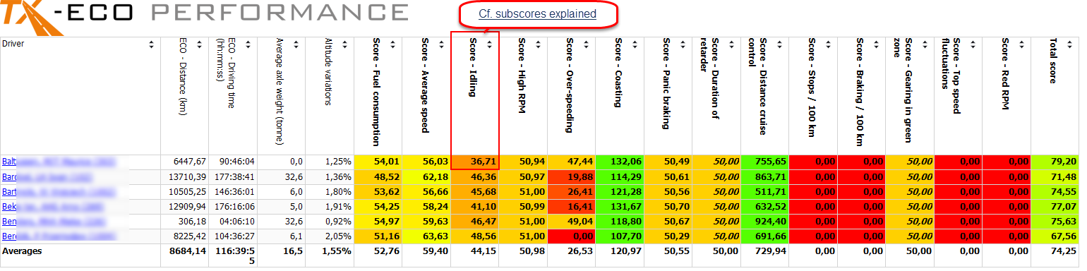 The TX-ECO PERFORMANCE report provides a score card of the selected driving style indicators for the selected drivers. All subscores use the parameters defined in the selected profile.
