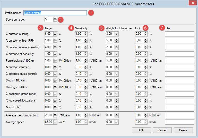 Note: For most subscores, the goal is to keep the score as low as possible, but for some parameters, the goal is to have a higher subscore, i.e. "Average speed", "Coasting", "Distance cruise control". In these cases, the above formula is slightly different: Subscore = Score on Target - (Target subscore - Actual value) / Sensitivity) |