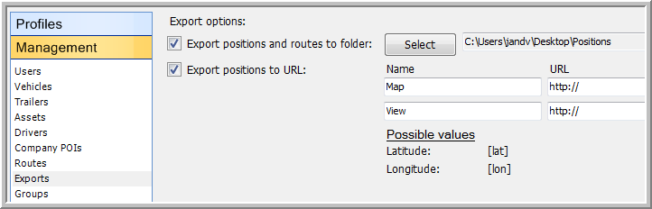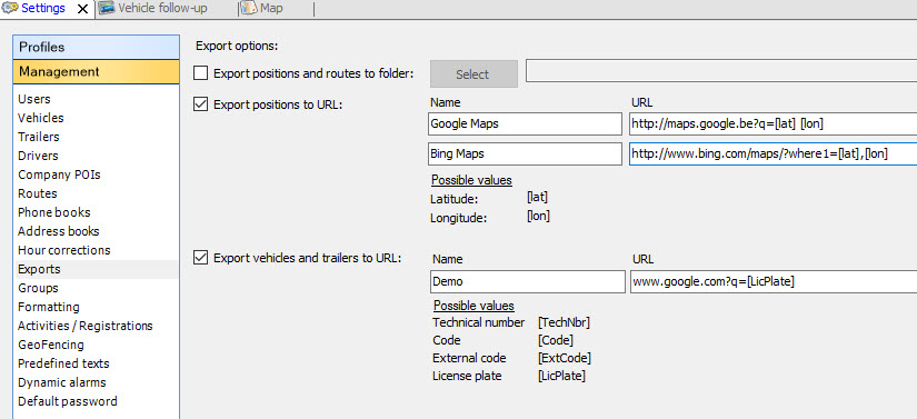 Starting from the Map and Vehicle follow-up, you can choose to export the positions to a folder or a URL. This can be configured under Settings > Management > Exports.