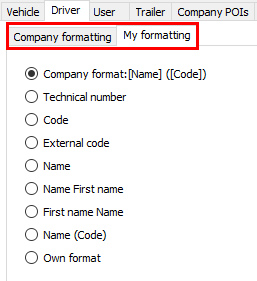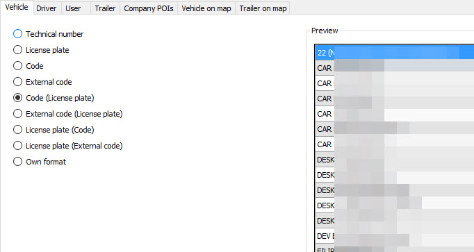 Here you can choose the way in which vehicles, drivers, dispatchers, trailers and leased vehicles are displayed in the "Vehicle follow-up" and "Driver follow-up" windows. (This is the company-wide definition of "naming" a vehicle / driver / dispatcher / trailer.)