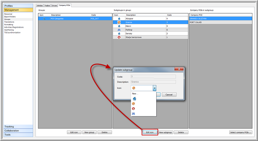 In the "Company POIs" tab page, an extra button Edit icon is provided. Here, it is possible to assign an icon both to POI groups and subgroups. These icons are used to visualize the POI on the map, but keep in mind that: