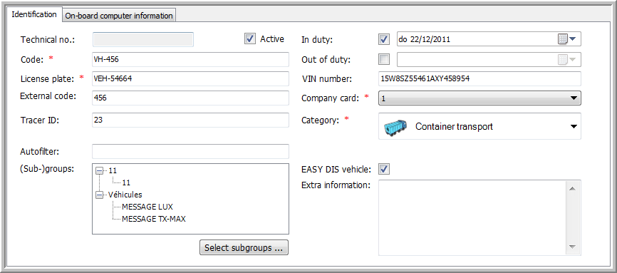 The technical number is a code that is automatically generated by the software. It is used for assigning data to the correct vehicle. Deselect the checkbox to deactivate the vehicle (vehicles cannot be deleted). |