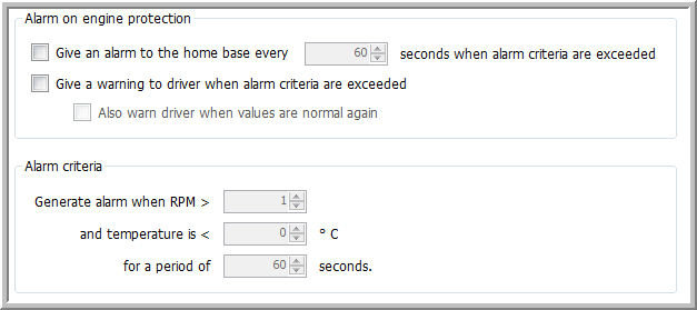On this tab page you can set alarm criteria relating to the engine. Next it is possible to define when and for how long an alarm should be given to the home base and / or the driver when these criteria are exceeded. When no checkboxes are checked, the alarm criteria are disabled.