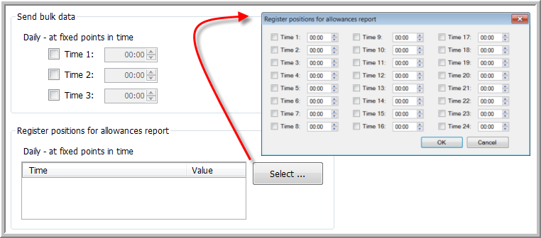 Click the Select button to set 24 fixed points in time for the allowances report. |