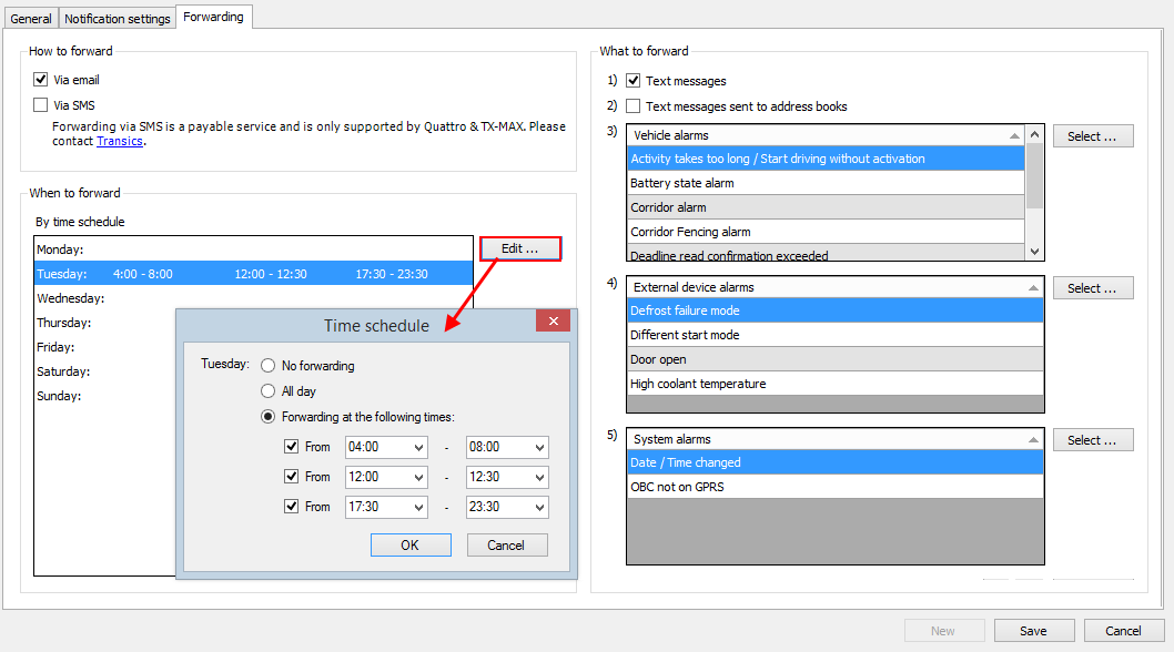 Here you can set 3 periods per day, during which the selected alarms should be forwarded. To do so, click the Edit button and select the start and end time of each period.