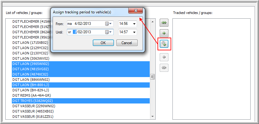 works in exactly the same way as the other buttons, except that you have to define a period for the selected vehicle(s) or trailer(s).