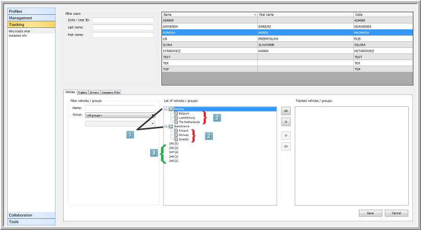 · The lower zone contains the details, showing which vehicles, trailers, drivers, company POIs or assets the selected user follows up.