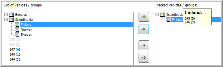 In this example, the vehicles are grouped per country. The dispatcher needs to follow up the trucks in Finland. Both in the list of vehicles and tracked vehicles, you can hover over the selected country to see which vehicles belong to this subgroup. This also applies to the other tab pages.