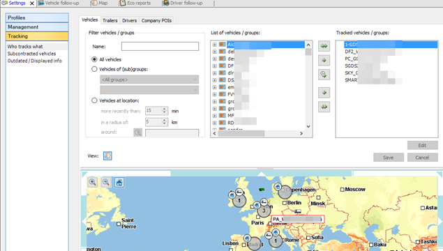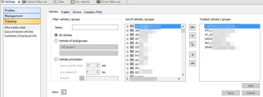 Under Settings > Tracking > Who tracks what, it is possible to define which user tracks which vehicles / trailers / drivers / Company POIs / assets.
