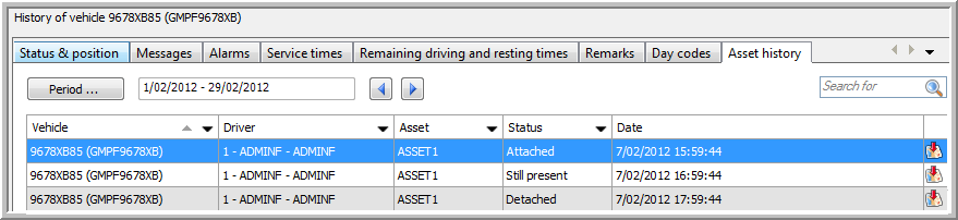 In this tab page, you can find detailed information on the asset, such as its status and position, the truck it was attached to, etc.