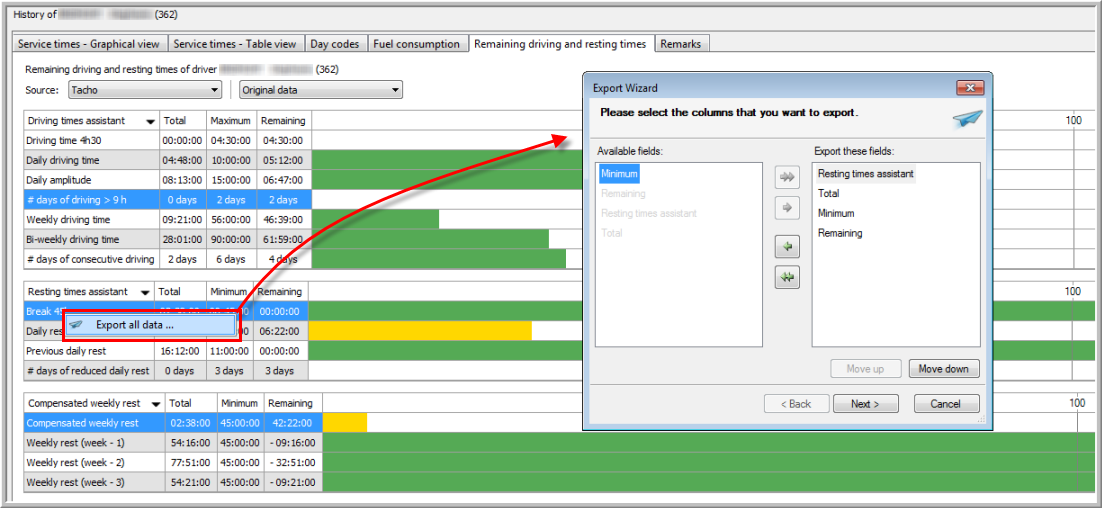 The driving and rested times can be exported. Click here for more information on exporting data grids.