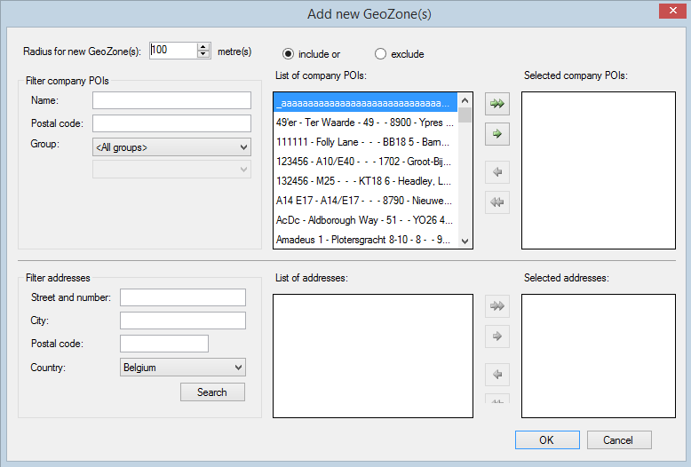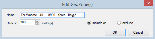 Overview of the GeoZones that are included or excluded for the selected dynamic alarm. Select a GeoZone to display it on the map on the right.