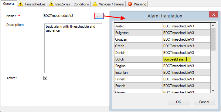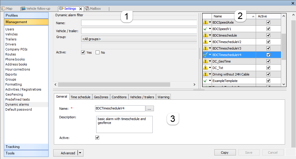 Dynamic alarms provide a framework for creating specific alarms using alarm templates. These templates allow to combine different conditions (temperature, speed, driving time, RPM, axle load, current activity ...) with specific time schedules and geozones.