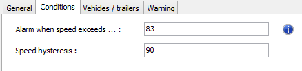 The Conditions tab page displays the alarm conditions configured in the template. E.g. "Alarm when speed exceeds ..." Different alarms can be combined. |