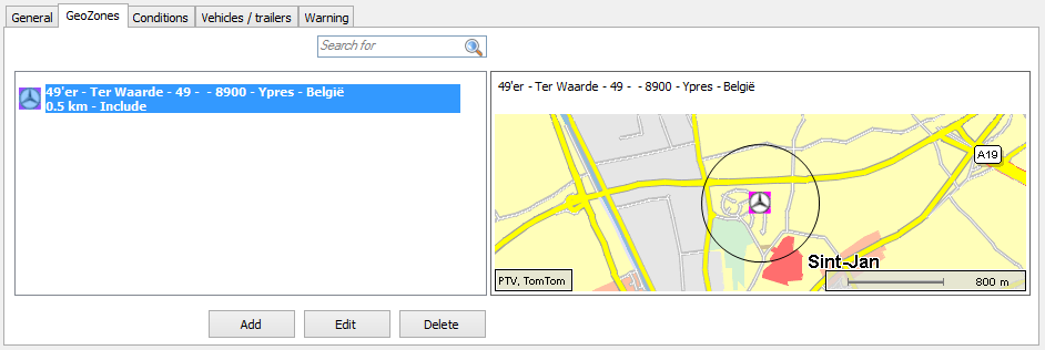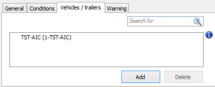 Use the Vehicles / trailers tab to (un)assign the alarm to vehicle / trailers. Press Add to add a vehicle / trailer. |