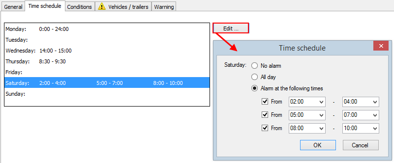 The bottom zone contains the detail tab pages: "General", "Time schedule", "GeoZones", "Conditions", "Vehicles / trailers", "Warning".