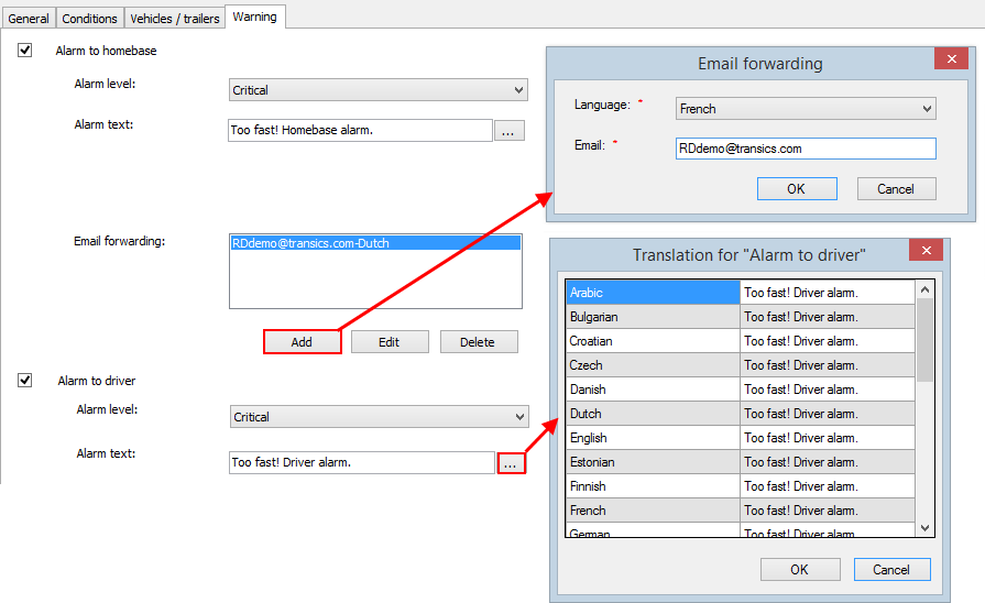 Note: Alarm templates can only be created, imported and edited by Transics personnel.