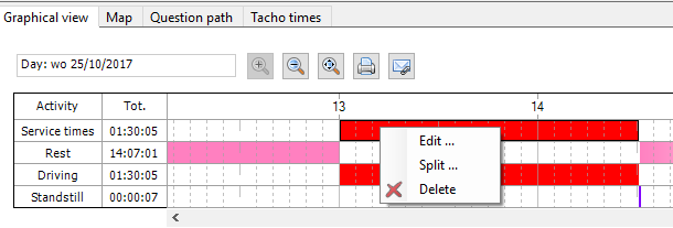 As from TX-CONNECT version 11.39, additional options are available in the "Activity report management" module: o Edit, split or delete an activity in the graphical view. § Tacho times tab page (TX-SKY only) |