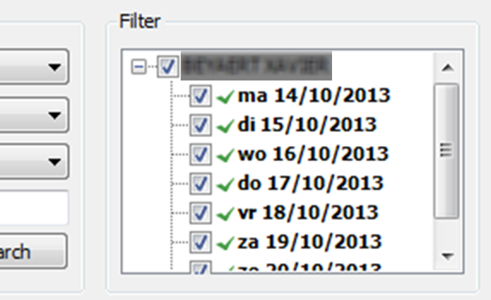 Filtr, który zawiera listę wybranych elementów. Można wybrać jednego kierowcę i/lub wiele dat, dla których mają zostać wyświetlone dalsze informacje. Daty wyświetlane pogrubioną czcionką zawierają informacje.