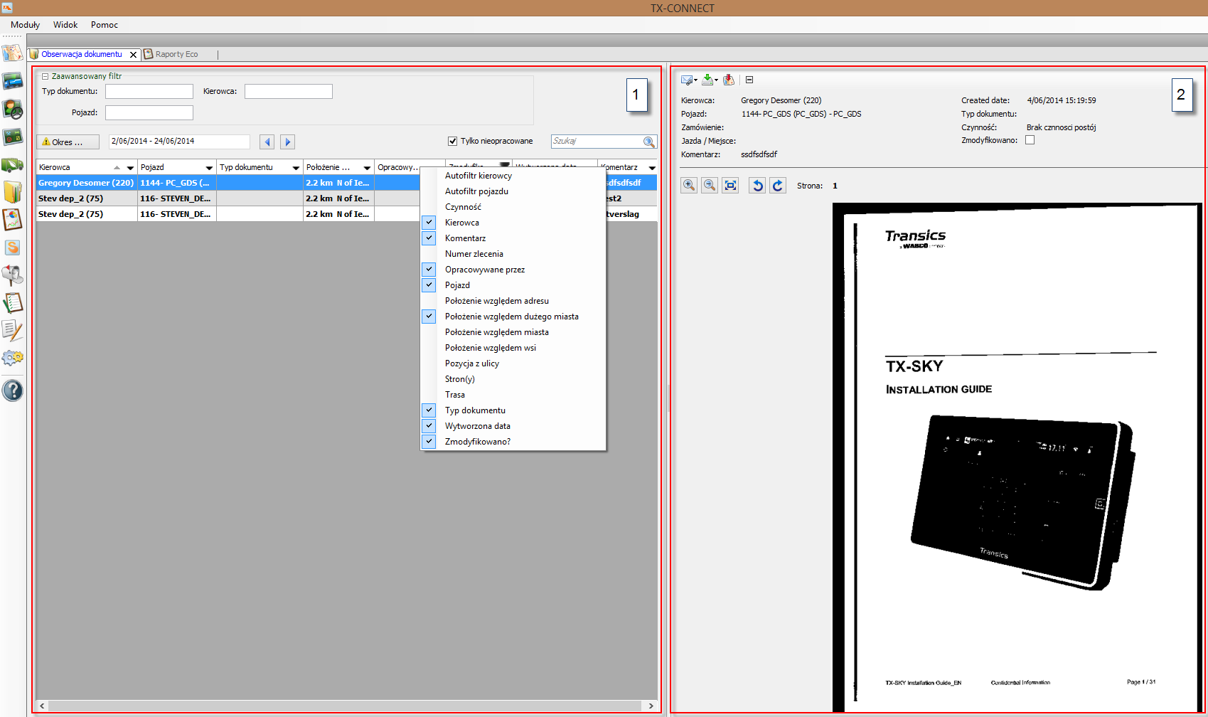 Rozwiń opcję Filtr zaawansowany, aby filtrować według Typu dokumentu, Pojazdu, Zamówienia lub Kierowcy.