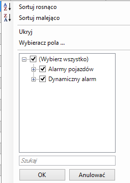 Kolumna Rodzaj alarmu umożliwia odfiltrowanie alarmów dynamicznych lub alarmów dotyczących pojazdu: