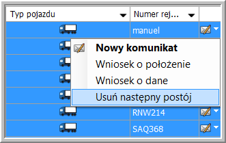 Wybierz jeden lub więcej pojazdów i kliknij Usuń następny postój na rozwijanej liście. Ta opcja będzie widoczna tylko dla pojazdów, do których przypisano następny postój. Uwaga: Następny postój zostanie usunięty tylko z pojazdów, które zostały zaznaczone.