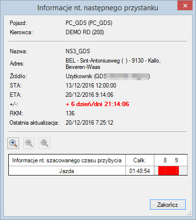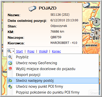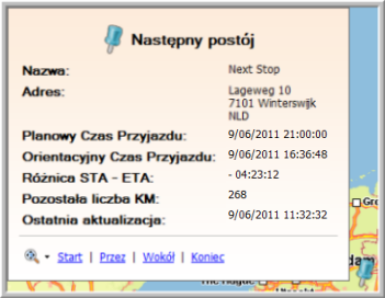 Następny postój to miejsce lub położenie, do którego musi pojechać kierowca po wykonaniu aktualnej (zaplanowanej) czynności. W ten sposób można obliczyć w bazie oczekiwany i wyznaczony czas przyjazdu.