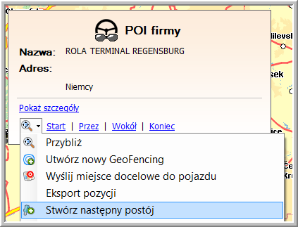 Wyszukaj na mapie punkt POI, dla którego chcesz utworzyć następny postój, a następnie kliknij przycisk Utwórz następny postój: