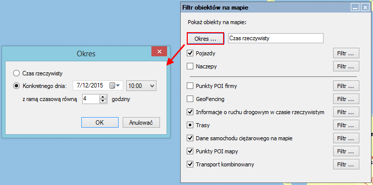 Kliknij pozycję Okres ..., aby ustawić datę, czas i ramy czasowe (+/- x godzin) dla pozycji pojazdu / naczepy, które mają być wyświetlone na mapie. |
