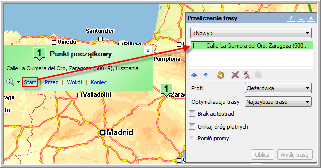 Po odnalezieniu adresu dla trasy można go oznaczyć jako punkt na trasie. Należy kliknąć przycisk Początkowy, aby oznaczyć ten adres jako pierwszy punkt na trasie. Otworzy się okno „Obliczanie trasy”. W celu obliczenia trasy konieczne jest ustawienie punktu początkowego i końcowego.