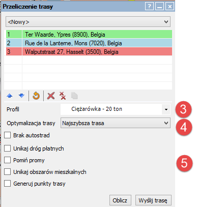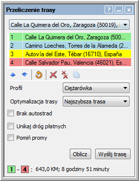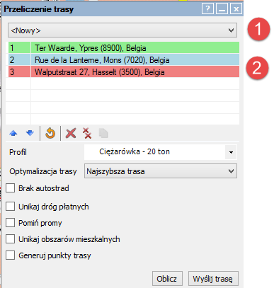 Naciśnij przycisk Oblicz, aby obliczyć trasę na podstawie skonfigurowanych punktów trasy i ustawień. Trasa zostanie obliczona na podstawie kolejności, w jakiej adresy były dodawane do listy. W lewym dolnym rogu okna wyświetla się liczba kilometrów między punktem początkowym a końcowym oraz szacowany (na podstawie prędkości jazdy ciężarówki) czas potrzebny na dojechanie z punktu początkowego do końcowego. Jeśli trasa przebiega przez morze, wyświetla się liczba kilometrów i średni czas podróży promem. Ewentualne opłaty drogowe (winiety...) i podatki ekologiczne wyświetlane są dla poszczególnych państw we właściwej walucie.