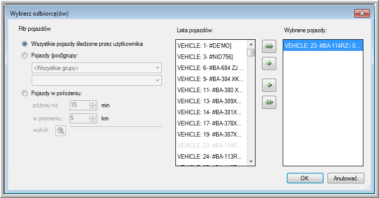 Po kliknięciu Do uzyskasz listę wszystkich dostępnych pojazdów, do których możesz wysyłać komunikaty.