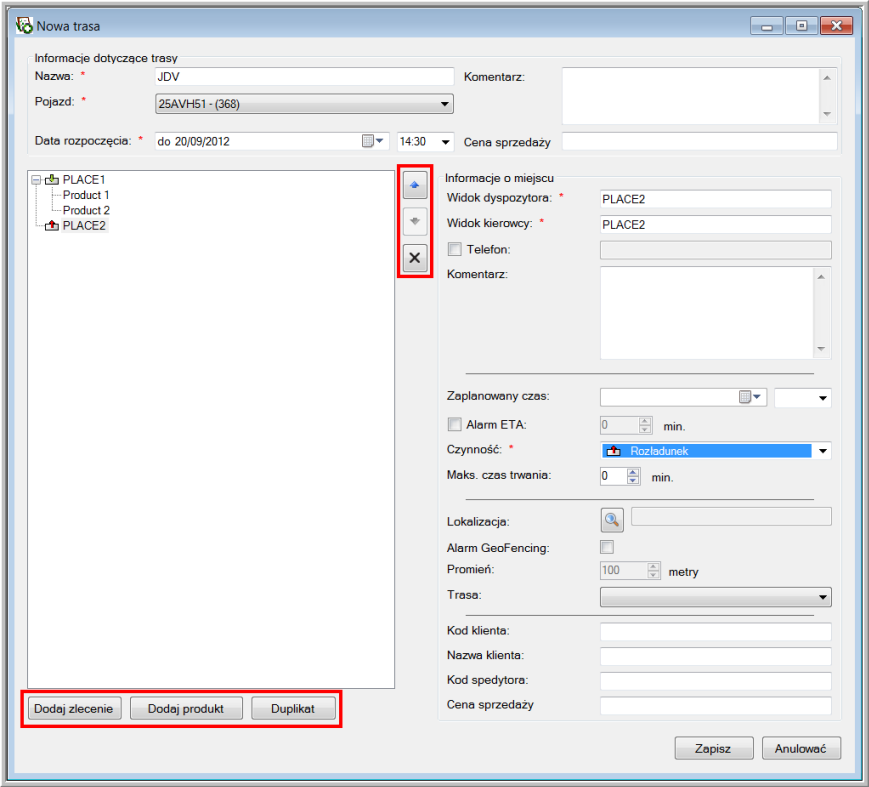 Duplikowanie pozycji spowoduje skopiowanie wybranego miejsca w widoku trasy.